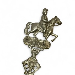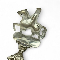 | Kavel | 2421. Zilveren geboortelepel, ruiter te paard, zonder inscriptie |