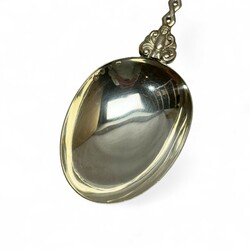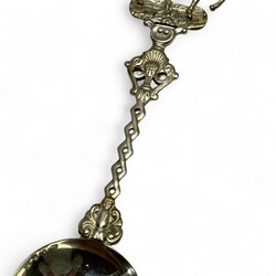 | Omschrijving | Een 20e eeuwse tweede gehalte (835/1000) zilveren geboortelepel met getorste steel, bekroond met een ruiter te paard. Aan de binnenzijde van de bak gekeurd met een lopende leeuw, minervakopje, meesterteken N10 = Niekerk, Schoonhoven en jaarletter Q = 1976. |