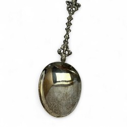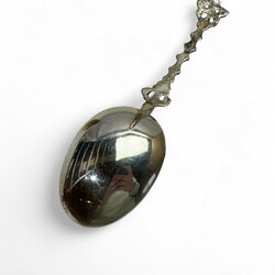 | Omschrijving | Een 20e eeuwse eerste gehalte (835/1000) zilveren geboortelepel met getorste steel, bekroond met een ruiter te paard. Aan de binnenzijde van de bak gekeurd met een staande leeuw, jaarletter S (2002) en enkele onduidelijke keuren. |