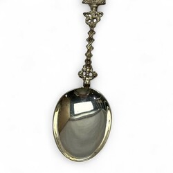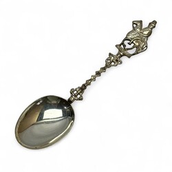 | Omschrijving | Een 20e eeuwse eerste gehalte (925/1000) zilveren geboortelepel met getorste steel, bekroond met een ruiter te paard. Verso gekeurd met lopende leeuw, minervakopje, meesterteken DA+ = Aubert, Den Haag en jaarletter O = 1998. |