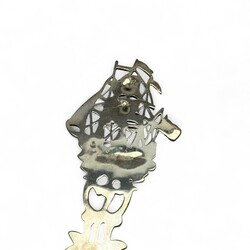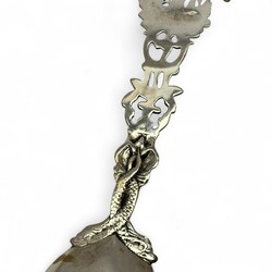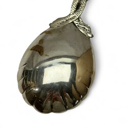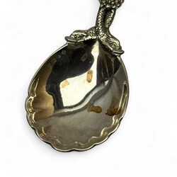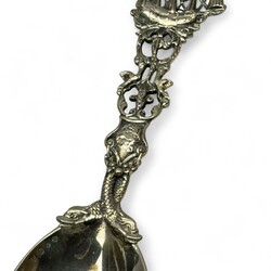 | Omschrijving | Een 20e eeuwse eerste gehalte (925/1000) zilveren sierlepel, met geschulpte bak, twee dolfijnen, Hollandse Leeuw, bekroond met een driemaster. Aan de binnenzijde van de bak gekeurd met staande leeuw, minervakopje, meesterteken ZZ = Zaanlandse Zilversmederij en jaarletter S (1978). |
