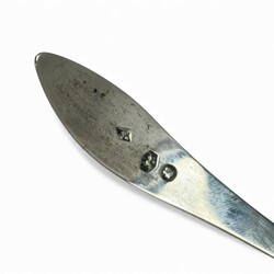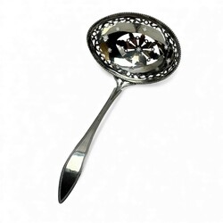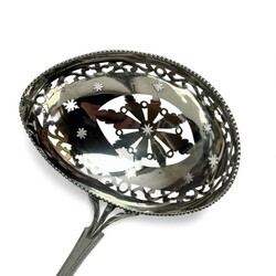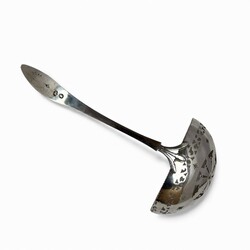 | Omschrijving | Een antieke 19e eeuwse tweede gehalte (835/1000) zilveren strooilepel. Empire, met schuitvormige bak, ajour gezaagd. Meesterteken ‘WS’ in ruit = waarschijnlijk Willem Lammert Schmitz, werkzaam te Leeuwarden,, jaarletter H (1817). |