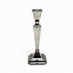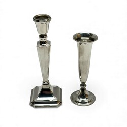 | Omschrijving | Een 20e eeuwse eerste gehalte (925/1000) zilveren kandelaar op achtkantige voet. Mr. van Kempen & Begeer, Voorschoten, jaarletter S (1978). Met daarbij een 20e eeuwse tweede gehalte (835/1000) zilveren orchidee vaasje, gekeurd met een zwaardje en een onduidelijk meesterteken. |
