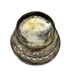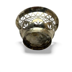 | Omschrijving | Een antiek vroeg 19e eeuws tweede gehalte (835/1000) zilveren wolmandje. Ajour gezaagd, met hengsel. Gekeurd met jaarletter U (1829). |