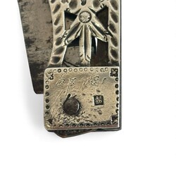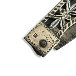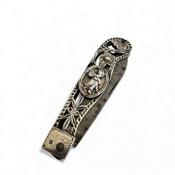 | Omschrijving | Een antiek 19e eeuws tweede gehalte (835/1000) zilveren zakmesje, opengewerkt en aan beide zijden met medaillon, voorstelling van fluitspelende man en musicerende vrouw. Gegraveerd met initialen ‘T.K.V.’ en gemerkt met meesterteken 67JF = Jan Piers Fennema, werkzaam te Bolsward van 1827 tot 1837. Stalen blad gemerkt ‘Gottlieb Hammesfahr Solingen’, vermoedelijk van latere datum. |
