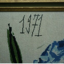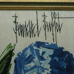 | Omschrijving | Een geweven kunstwerk in lijst. Bloemstilleven, asters in een vaas. Ontwerp van Bernard Buffet (1928-1999) 1971. Uitvoering DMC, Frankrijk. |