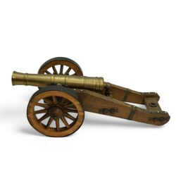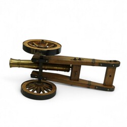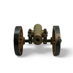 | Omschrijving | Een 20e eeuws miniatuur bronzen kanon op houten onderstel. Gemerkt 'Voere West-Germany' op het kanon zelf. |