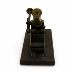 | Omschrijving | Een 20e eeuwse bronzen tafelkanon op houten voet, met draaimechanisme |