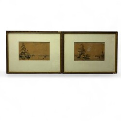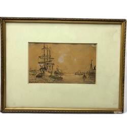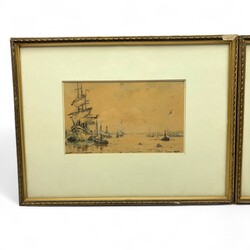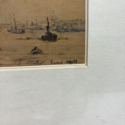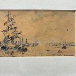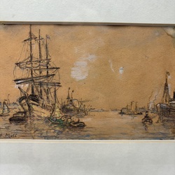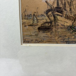| Omschrijving | Gemengde techniek op papier, twee schetsen van havens. Rechtsonder gesigneerd Evert Moll (Voorburg 1878 - Den Haag 1955) |