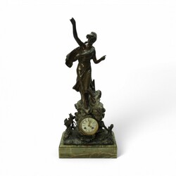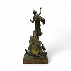 | Omschrijving | Een antieke 19e eeuwse Franse pendule, voorstelling van een vrouw en een geitje, op onyx voet. |