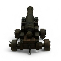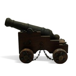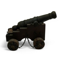 | Omschrijving | Een 20e eeuws gietijzeren miniatuur kanon, op houten sokkel, met houten wielen. |