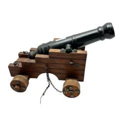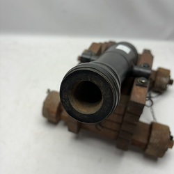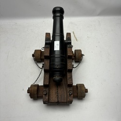 | Omschrijving | Een 20e eeuws zwart ijzeren tafelkanon op houten onderstel. |