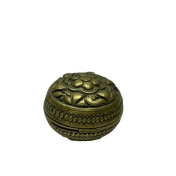 | Omschrijving | Lot van drie Indonesische messing objecten: een kwispedoor, betelnootdoosje en dekseldoos. |