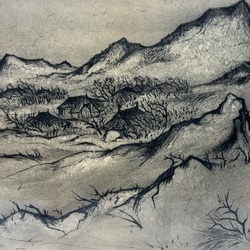 | Omschrijving | Jan Murk de Vries (1919-2015). Zwarte inkttekening op papier. Huisjes in de duinen van Terschelling ca 1957. Gesigneerd LO. |