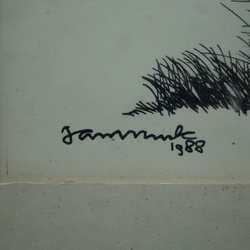 | Omschrijving | Pentekening op papier, voorstelling van een landschap. Rechtsonder gesigneerd Jan Murk de Vries (Bolsward 1919 – Harlingen 2015), gedateerd 1988. |