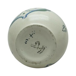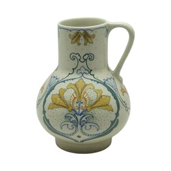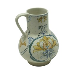 | Omschrijving | Een Arnhem platelen oorkan. Model nr. 253. Gestilleerd polychroom floraal decor op witte fond naar een ontwerp van Klaas Vet (1876-1943). |