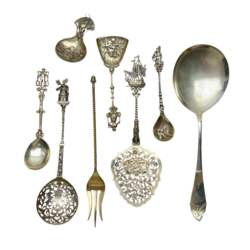 | Omschrijving | Lot met tweede gehalte (830/1000) zilveren theelepeltjes en divers schepwerk. Steel bekroond met oa hanekam Diverse meester en jaartallen. Totaal 120 gram. |