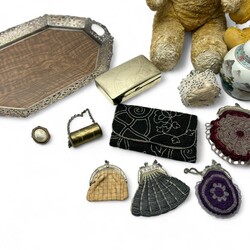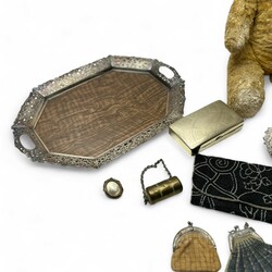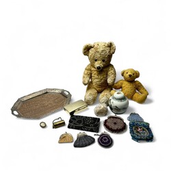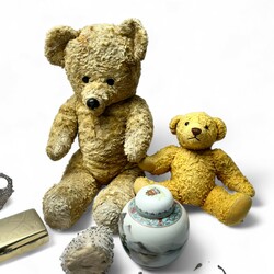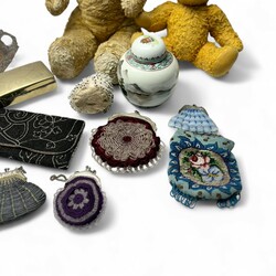 | Omschrijving | Lot diversen, waaronder twee oude Teddyberen, een houten dienblad met opengewerkte, verzilverde rand en een Chinees 20e eeuws gemberpotje |