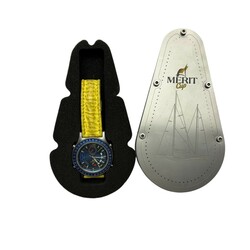 | Omschrijving | Een 20e eeuws herenhorloge, Merit Cup. Model Regatta, stalen kast, op gele Regatta band, met origineel doosje en papieren. |
