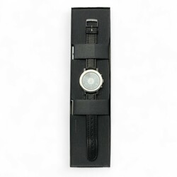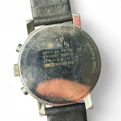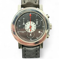 | Omschrijving | Een 20e eeuws herenhorloge, Modaine. Chronograaf, op zwart lederen band, ca. 1996. In Mondaine doosje, met papieren. |