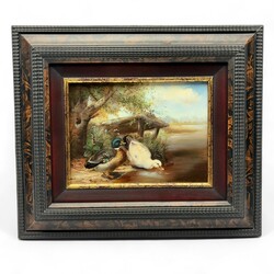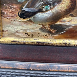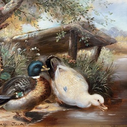| Omschrijving | Schilderij, olieverf op paneel. Twee eendjes aan het water. Linksonder gesigneerd Ray Jacob. |