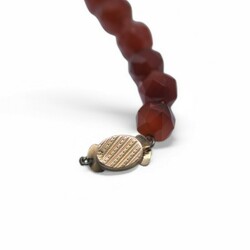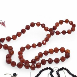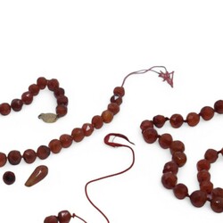 | Omschrijving | Lot van drie snoeren: een geknoopt carneolen snoer, een carneolen snoer met 14 karaats (585/1000) gegraveerd gouden slotje, en een eenrijig snoer van gefacetteerde glasgranaat, gebroken. |