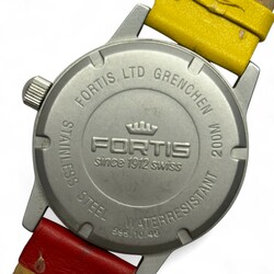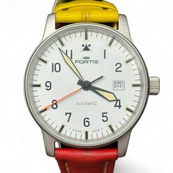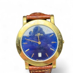| Omschrijving | Lot van twee Fortis horloges: één Flieger, ref. 595.10.46, op rood-gele Fortis band. En één 71093 met vergulde kast en donkerblauwe wijzerplaat met datumaanduiding. In blikken doosje. |