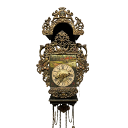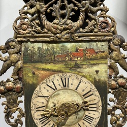 | Omschrijving | Een 20e eeuwse Friese stoelklok met polychroom beschilderde wijzerplaat, met gestoken decor van o.a. Vadertje Tijd |