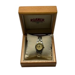 | Omschrijving | Een modern dameshorloge, Roamer. Quartz, Stalen kast en stalen band, met doosje en papieren. |