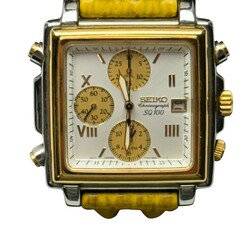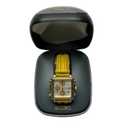 | Omschrijving | Een 20e eeuws herenhorloge, Seiko SQ 100. Chronograaf met dagaanduiding en alarm. Vierkante, stalen kast met gouden accenten, op gele lederen band. Met doosje en papieren. Ref. 7t32-5A20 |