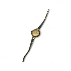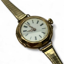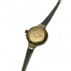 | Omschrijving | Een antiek 14 karaats (585/1000) geelgouden dameszakhorloge, ca. 1900, verbouwd tot polshorloge, op onedele band. |
