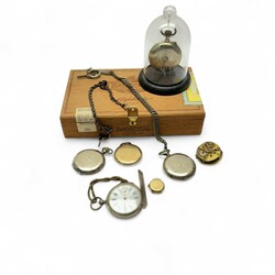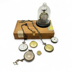 | Omschrijving | Lot diverse horloges, waaronder een 14 karaats (585/1000) geelgouden dameshorloge, laat 18e of vroeg 19e eeuws snek uurwerk, gemerkt Tarts London, een verguld Bulova zakhorloge, een Roskopf zakhorloge en gevlochten tweede gehalte (835/1000) zilveren horlogeketting |
