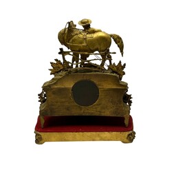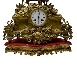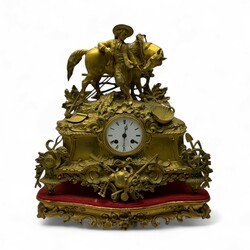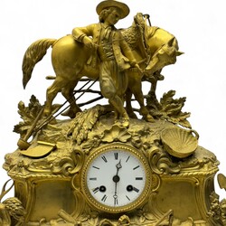 | Omschrijving | Een antieke 19e eeuwse Franse pendule. Verguld, met geëmailleerde wijzerplaat en bekroond met ruiter en paard. Op houten basement. |