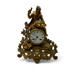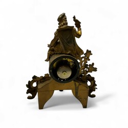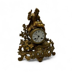 | Omschrijving | Een antieke 19e eeuwse Franse vergulde pendule, ca. 1870, bekroond met een edelman met jachtvogel. Emaille wijzerplaat met Romeinse cijferaanduiding. |
