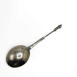 | Omschrijving | Een antieke verguld zilveren apostellepel, verguld, met getorste steel. Aan de achterzijde gegraveerd met wolf of vos en drie pseudokeuren |