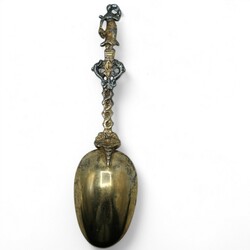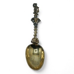 | Omschrijving | Een antieke 18e eeuwse zilveren vergulde geboortelepel, bekroond met De Wijsheid. Met onduidelijke stippelgravure 'Hiltje Jonga' en datering '1689' |