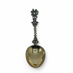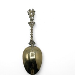 | Omschrijving | Een antieke 18e eeuwse zilveren, deels vergulde geboortelepel met getorste steel en steelbekroning van De Vriendschap. Onduidelijk meesterteken, gegraveerd in stippelgravure '1785' |
