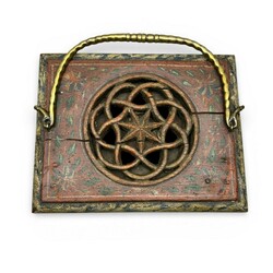 | Omschrijving | Een antiek 19e eeuws Hindelooper beschilderd stoofje, met spiegelmonogram in het deurtje aan de voorzijde, tevens met datering '1863', en opengewerkt met Turkse knopen rondom. Aan messing greep. |