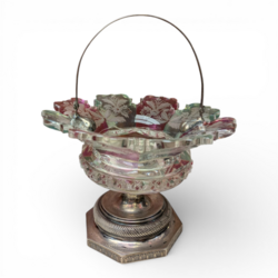 | Omschrijving | Een antieke 19e eeuws gekleurd kristallen bonbonmand met slijpsel, op tweede gehalte (835/1000) achtkantige zilveren voet, en met zilveren greep. Mr. Petrus Kroijmans, werkzaam te s'-Hertogenbosch van 1827-1844. |