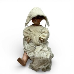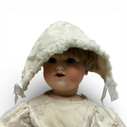 | Omschrijving | Een antieke pop met een porseleinen hoofd, slaapogen en met open mond. Met papiermaché benen en handen. Gekleed. Gemerkt met een nummer 990 en A14M voor Armand Marseille. Ca 1910.. |