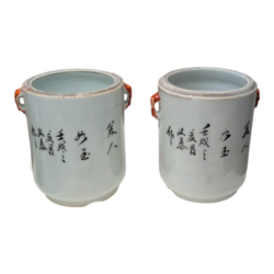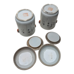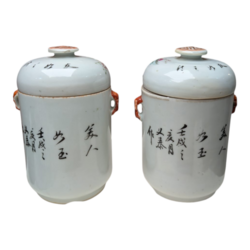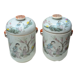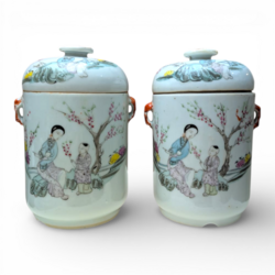 | Omschrijving | Een stel antieke Chinees porseleinen dekselpotjes met binnendeksels. De potjes met twee oren en beschildering met vrouw en kind in landschap, aan de andere zijde met karaktertekens. Qianjiang Cai, na 1911. |