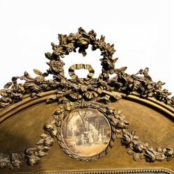 | Omschrijving | Een antieke Franse spiegel met halfronde bovenzijde en versierd met florale strik, guirlandes en een rond medaillon met prent. Ca 1900. |
