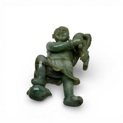 | Omschrijving | Een Chinees uit groen mineraal (Jade?) gestoken sculptuur. Voorstellende een dansend zotje met perzik. 20e eeuws of ouder. |