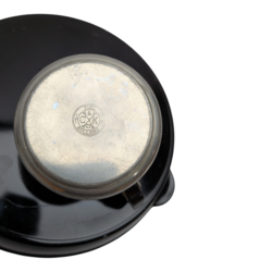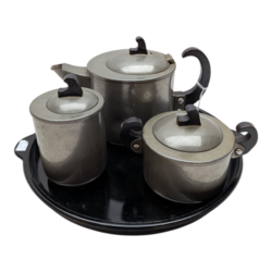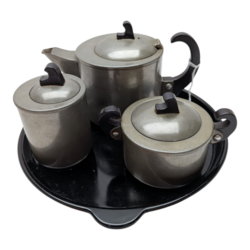 | Omschrijving | Een driedelig tinnen ART DECO theestel,13 cm hoog. bestaande uit een theepot, suikerpotje en een theebusje. Voorzien van bakelieten grepen. Gemerkt Kurz & Co, Tiel. Ca 1930. Ontwerper onbekend. Op een zwart persglazen dienblad. |