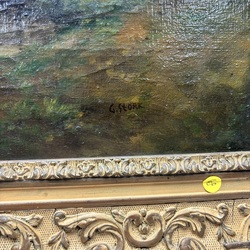 | Omschrijving | Painting, oil on canvas, depiction of a harbor view with boats and city silhouette in evening light. Signed G. Stork (20th century). In richly ornamented frame. |