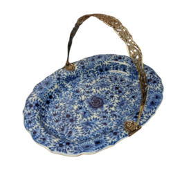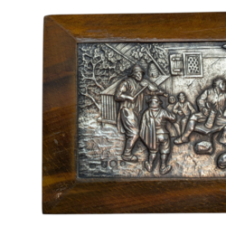 | Omschrijving | Lot: een 20e eeuws houten doosje met eerste gehalte (925/1000) zilveren plaquette op de deksel, voorstelling van muzikanten bij een herberg, naar 17e eeuws voorbeeld. Mr. van Kempen, jaarletter V (1930). Met daarbij een ovaal blauw-wit aardewerken schaaltje, Tichelaar Makkum, met tweede gehalte (835/1000) zilveren beugel. |