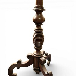 | Omschrijving | Houten rond bijzettafeltje op gedraaide centrale zuil met drie gehaakte poten. Rond blad met opstaande rand. |
