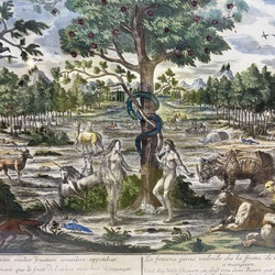 | Omschrijving | Ingekleurde gravure met Bijbelse voorstelling: Adam en Eva in het paradijs, met o.a. Latijns onderschrift 'Et aspiciens arborem mulier fructum comedere appetebat' [= En de vrouw zag de boom en wilde de vrucht ervan eten], zelfde onderschrift eveneens in Frans, Spaans en Duits, door Georg Balthasar Probst, tweede helft 18e eeuw |