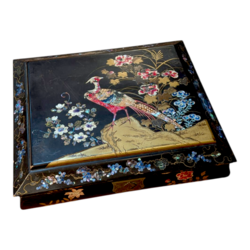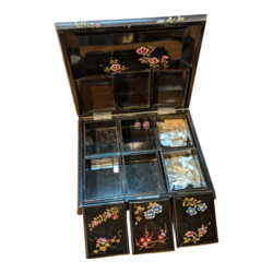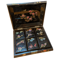 | Omschrijving | Een antieke 19e of vroeg 20e eeuwse Japans lakwerken speeldoos, beschilderd en ingelegd met parelmoer. Met zes binnenbakjes, waarvan twee gevuld met parelmoeren fiches, ronde en vierkante modellen, maar ook in de vorm van visjes. |