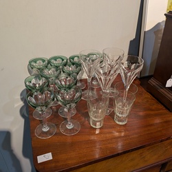 | Omschrijving | Lot kristal, bestaande uit vier champagnecoupes en tien wijnglazen met groen accent, allen op zeskantige voet. Ongemerkt, producent Val St. Lambert. Met daarbij vier kristallen drinkglazen, facetgeslepen. |